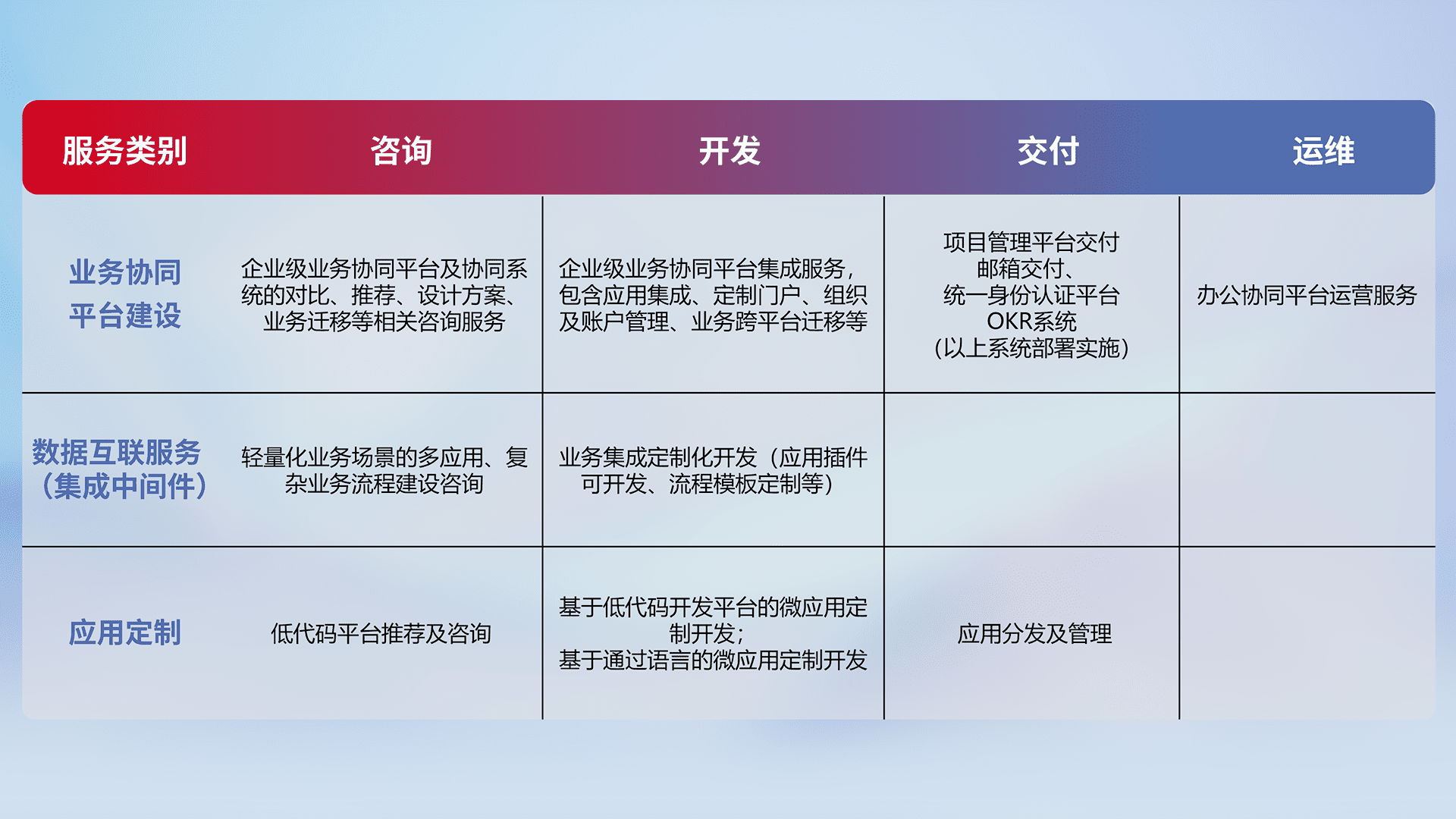 针对钉钉、、企微、、、IDaas等平台级产品提供产品的规划、、、、方案、、、交付、、、、定制化开发等服务,,,实现如统一协同办公、、、智能客户服务、、、、混合会议管理、、智能数据查询、、、等业务场景,,实现数字化转型。。