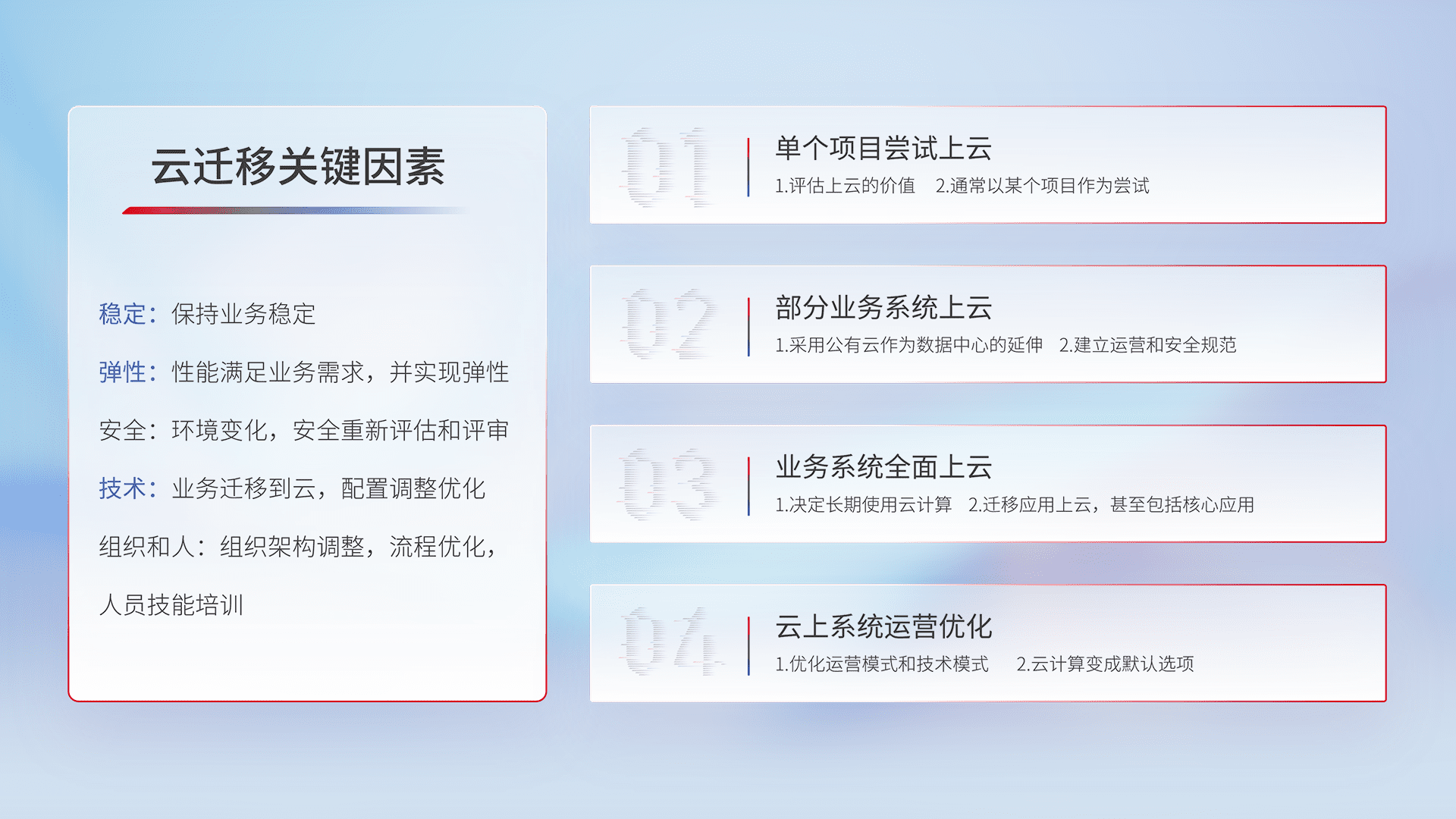 结合实际业务,,从规划设计、、、云平台选型、、、、云原生改造、、、数据迁移、、、集成交付,,,迁移全过程为客户识别最佳上云路径,,做好风险识别管理,,,,设计网络架构、、、、身份权限、、、安全审计合规、、、、操作审计、、、、日志审计、、、、监控告警策略、、、、多站点容灾设计等,,,,对云上基础设施进行整体规划,,,提升IT治理水平,,以满足弹性、、高可用、、、、高性能的需求。。