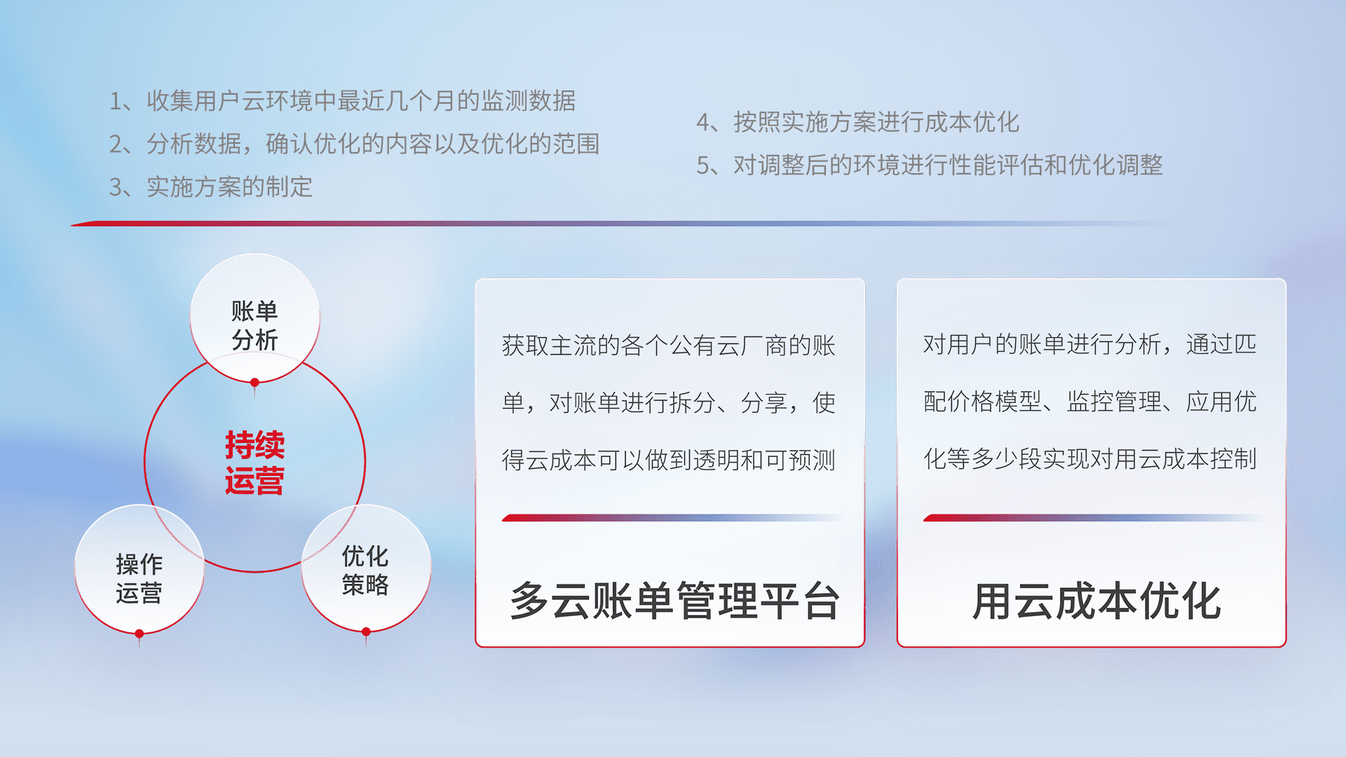 通过多云纳管,,,以统一的资源数据模型把客户的云资源进行抽象和封装,,进而实现对多云资源的统一操作,,保障云资源管理的可靠性、、、稳定性与可用性。。量身定制化运维内容,,配置、、、开发运维、、、补丁管理、、备份、、、监控、、、、认证和访问管理、、、、审计和日常巡检等,,保障在用云过程中的可靠度,,,,稳定度以及高可用率。。
