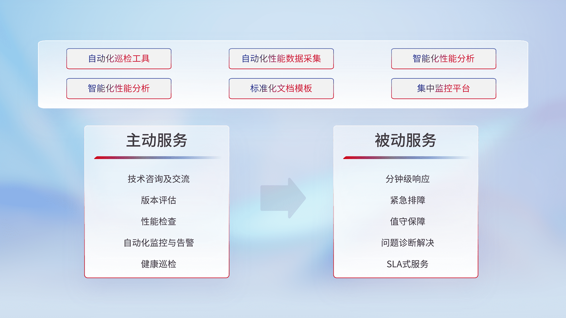 智能化工具和标准化文档,,保障服务质量,,提供主动服务(包含技术咨询、、、、版本评估、、、性能检查、、、、自动化监控与告警、、、、健康巡检)和被动服务包含(分钟级响应、、、紧急排障、、值守保障、、、、问题诊断解决、、SLA服务)。。